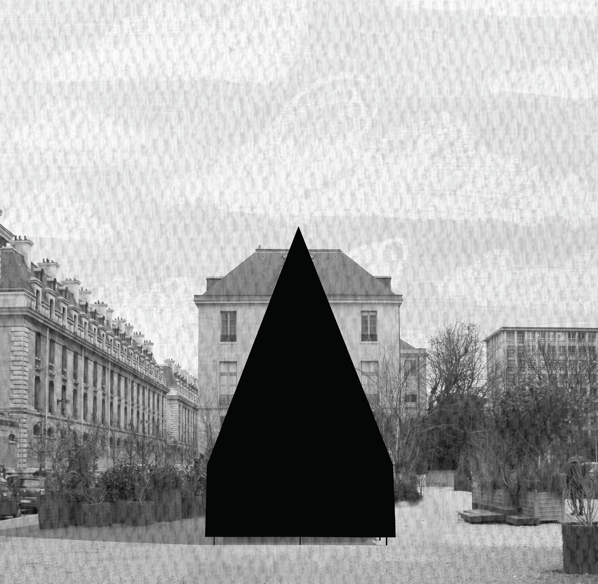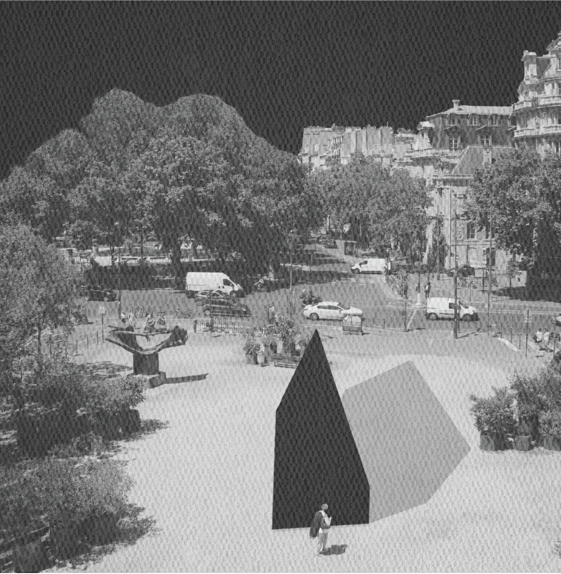 Although the place is surrounded by different kinds of ar- chitecture from different eras and various streets, the place itself is surprisingly quiet. It is filled with a couple of trees and a flat surface of fine gravel. The site has been used as the platform of various pavilions and events by the local archi- tecture museum, Pavilion de l’Arsenal. Even though the site is owned by a private institution, it is kept open to the public. Anyone, in any time of the year is welcome to enjoy this public place.