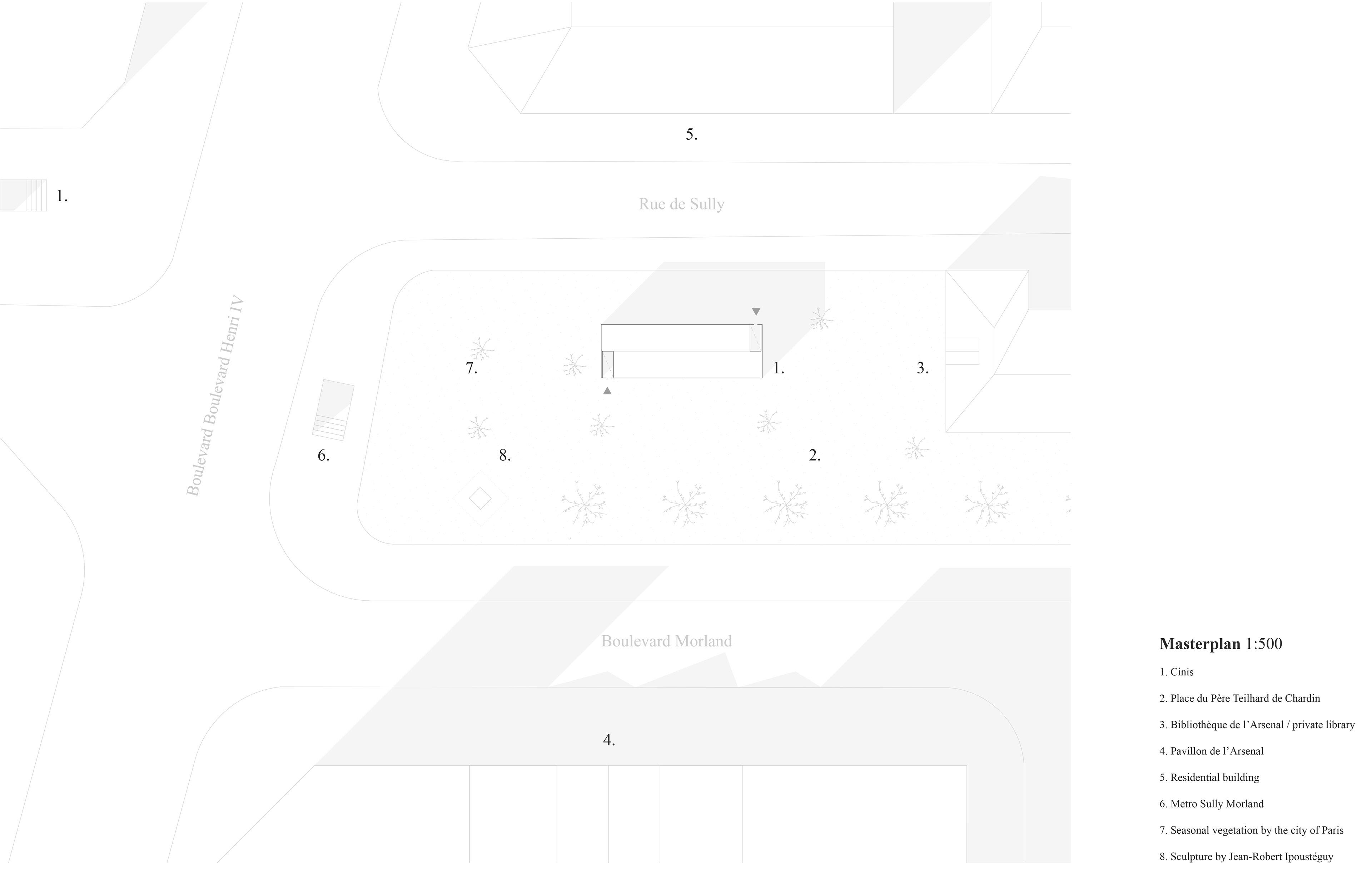 ''Cinis'' is a design for a silent retreat, an option for a religious and sacral space for all the citizens, religious of not. Situated in the very hearth of Paris, near by the Nôtre Dame Cathedral and la Bastille, it is open around the clock for all citizens.