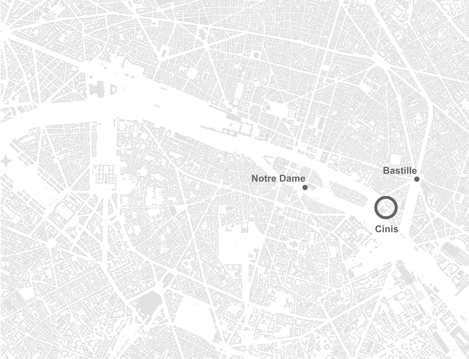 The site Cinis is located in this 4th arrondissement. The fa- mous Place de la Bastille is just nearby and the Cathedral of Nôtre Dame is only 10 minutes away.