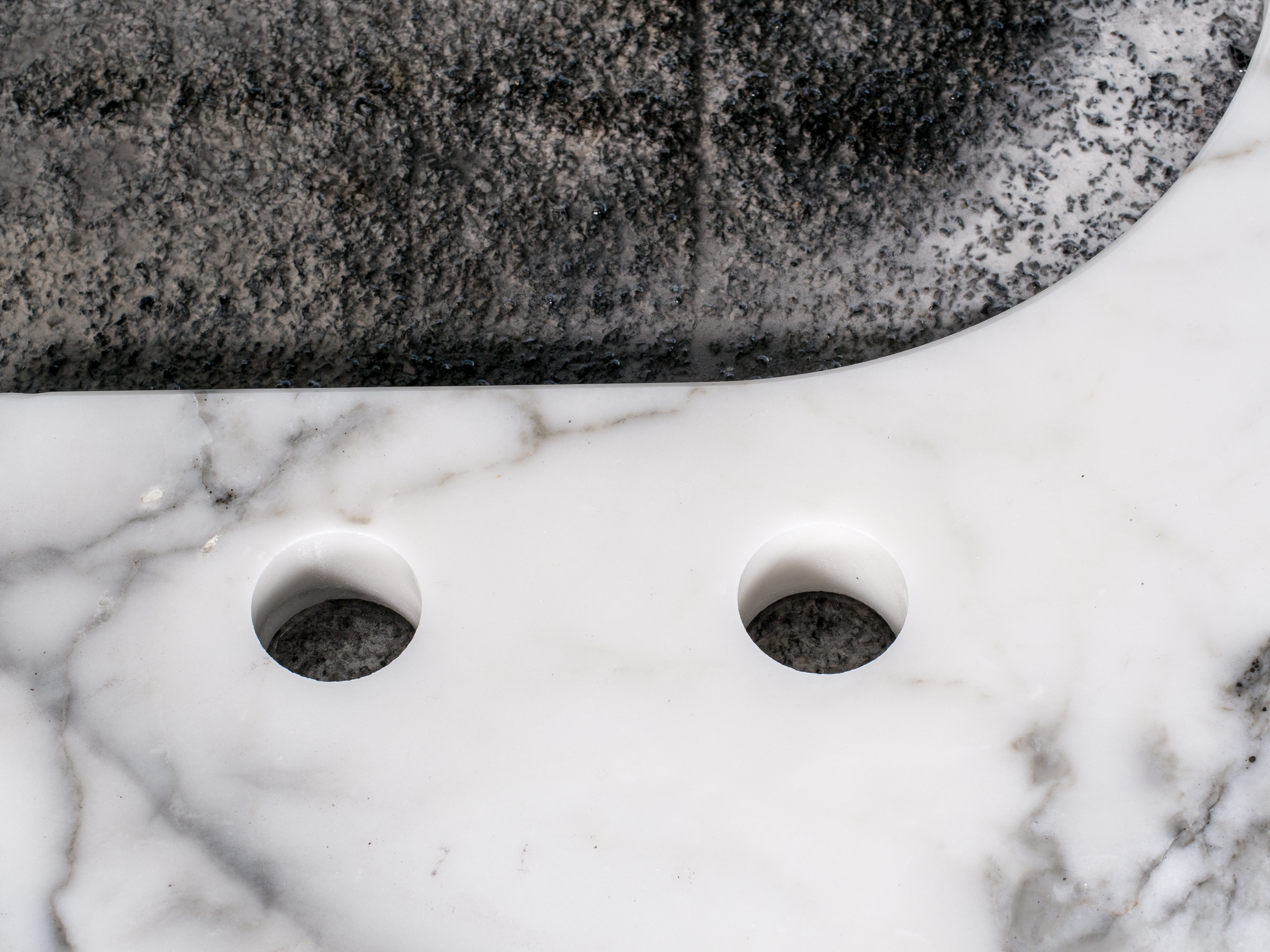Depending of the chosen light-type, the serie consist a section of various prod- ucts, done with marble stone. The light is being reflected by the backside of the stone, giving then a strong contrast between the heavy stone and the light it self. The backround wall is playing a strong role, as it reflects the light to the space. As a result comes then a very light and levitating fixture, the Oculus.